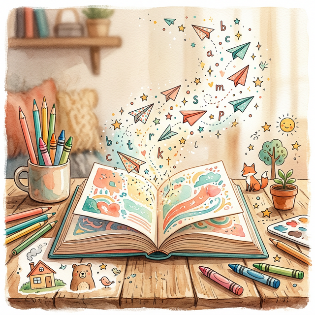 Oficina criativa onde crianças criam e ilustram seus próprios livros, estimulando a criatividade, escrita e expressão artística.